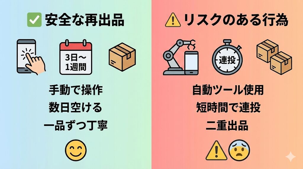 機械的な連投は避け、一品ずつ丁寧に操作することが、結果的にアカウントを守ることに繋がりますよ。