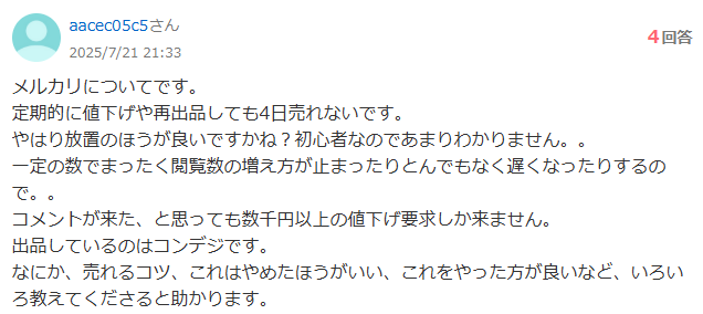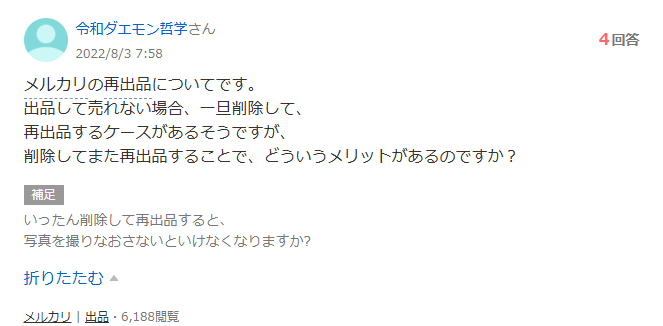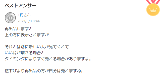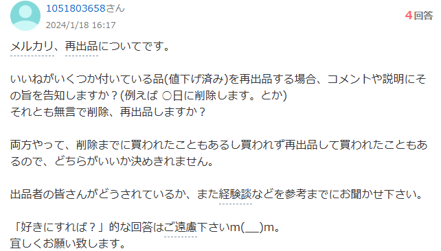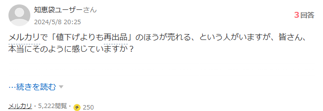 「値下げと再出品、どっちが正解?」という質問も知恵袋では多いです。
