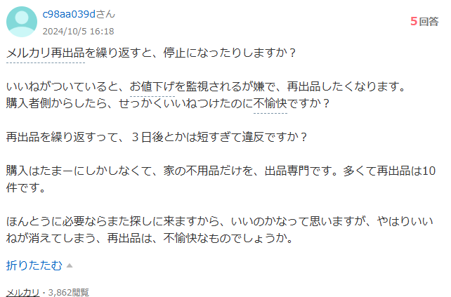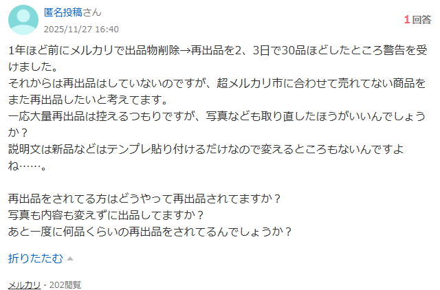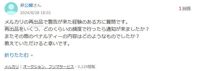 知恵袋でも、再出品で警告を気にする投稿が多く見られました。