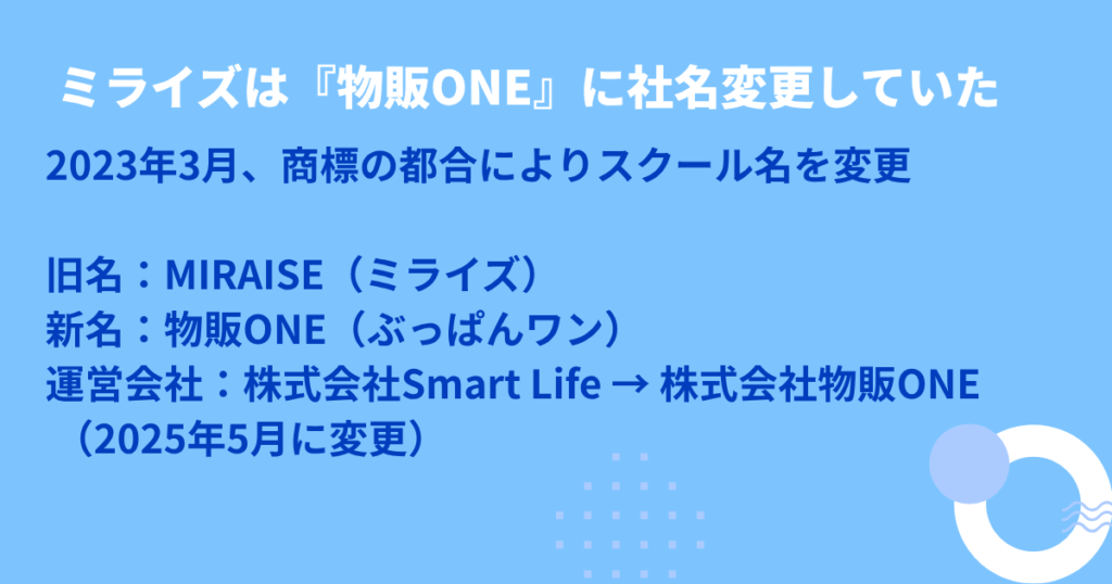 - 2023年3月:スクール名を「MIRAISE(ミライズ)」から「物販ONE」に変更