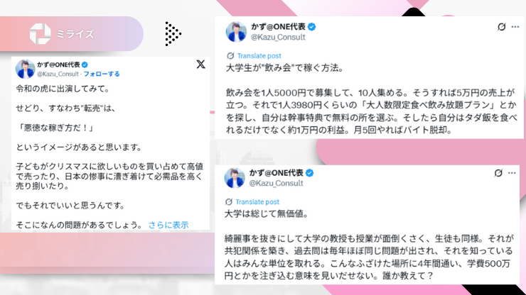 ただし、実際のところミライズは株式会社物販ONEが運営する法人スクールであり、代表者も顔出しで活動しています。