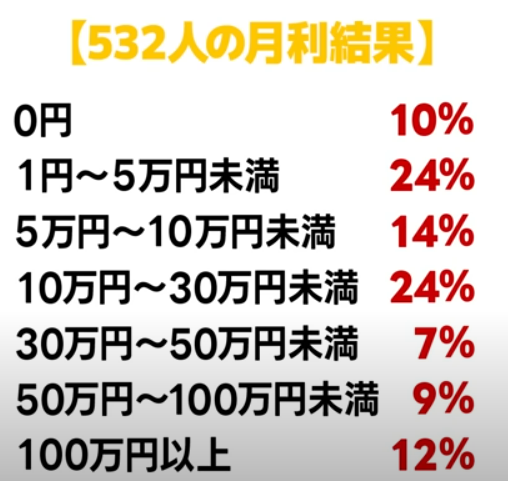 物販ONEが公表した532人の月利アンケートでは、5人に1人以上は月30万円以上の利益を達成しているのが実態です。