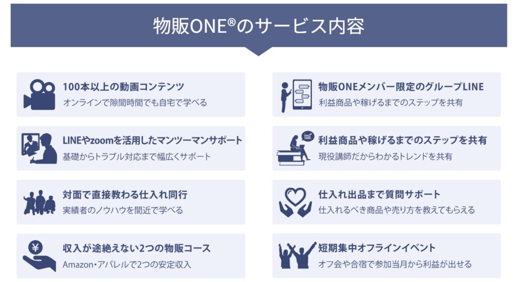 物販ONEは Amazon・メルカリ・eBay など、複数のプラットフォームに対応している総合型スクールです。