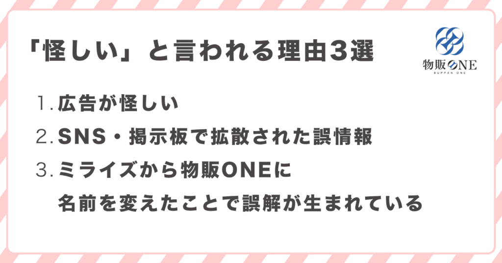 2023年頃に「物販ONE」へ名称を変更したことが、「別の会社にすり替わった」「過去を隠しているのでは」といった誤解を招いた要因のひとつです。